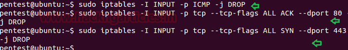 sudo iptables -I INPUT -p ICMP -j DROP sudo iptables -I INPUT -p tcp --tcp-flags ALL ACK --dport 80 -j DROP sudo iptables -I INPUT -p tcp --tcp-flags ALL SYN --dport 443 -j DROP