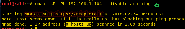nmap -sP -PU 192.168.1.104 --disable-arp-ping
