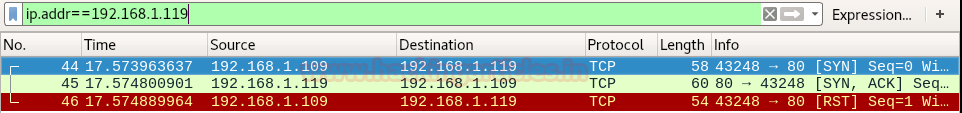 We will check Wireshark to find more information; as expected, as soon as the target machine received the TCP SYN packet, it replied with TCP RST, and NMAP interpreted it as the port being closed.