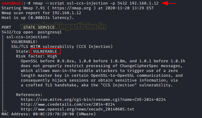 This script when run checks if a server is vulnerable to the SSL/TLS “CCS Injection” vulnerability. To exploit this vulnerability using MITM (Man in the Middle Attack), the attacker will then wait for a new TLS connection, followed by the Client-Server ‘Hello’ handshake messages.