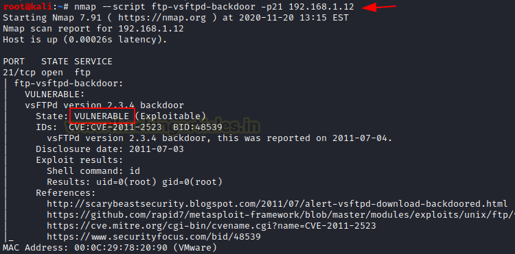 This script checks for the presence of vsFTPd 2.3.4 backdoor vulnerability by attempting to exploit the backdoor using a harmful command.