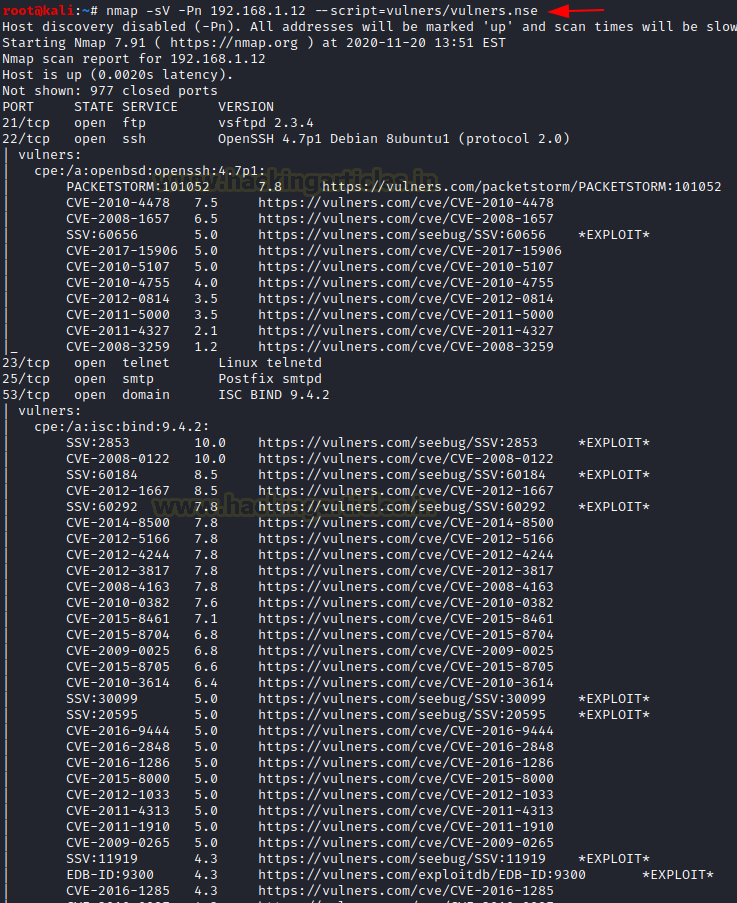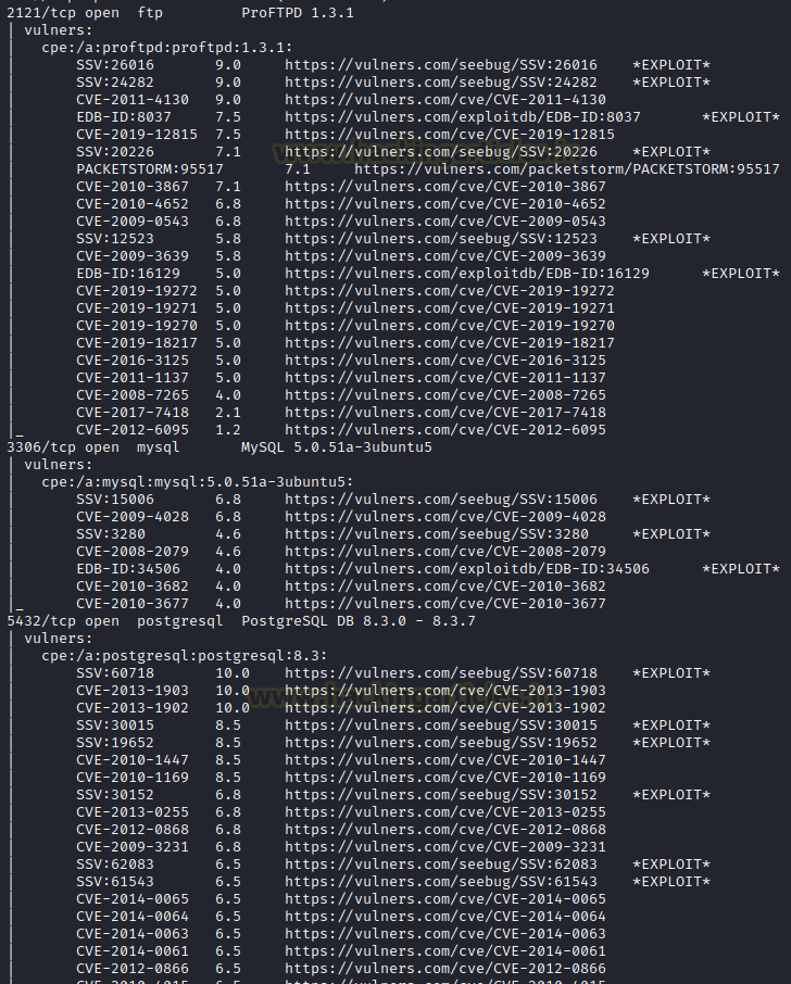 Nmap – Vulners is a NSE script using some well-known service to provide info on vulnerabilities. This script completely depends on having information on software versions therefore works with -sV flag.