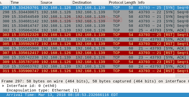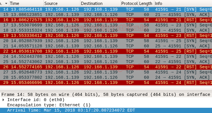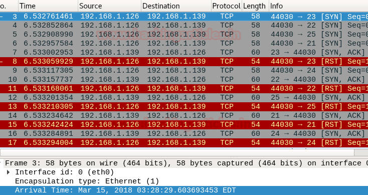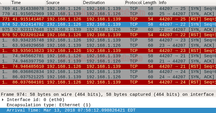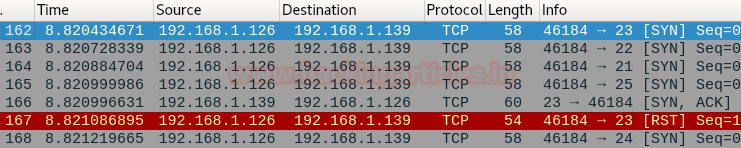 Here in Wireshark, we can see that no one resends the 1-1 TCP SYN packet to each port from source: 192.168.1.126 to destination: 192.168.1.139.