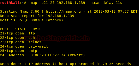 nmap -p21-25 192.168.1.139 --scan-delay 11s