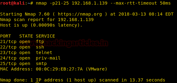nmap -p21-25 192.168.1.139 --max-rtt-timeout 50ms