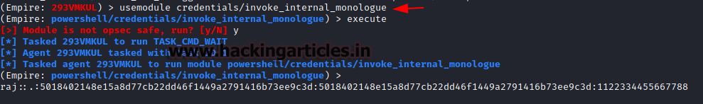 In case, the attacker decided to compromise the target machine through the PowerShell Empire and has an agent active, then they can perform a downgrade attack directly from PowerShell Empire. Inside the Credentials, the PowerShell Empire has a module called invoke_internal_monologue that essentially performs the same attack as the executable discussed earlier. This method doesn’t involve transferring an executable and running it on the target machine is much stealthier.