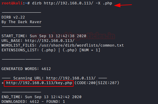 Next on our enumeration task is Directory Bruteforce. We used the dirb scan here. We tried some different variants. The one with the extension .php and wordlist common.txt gave us the key.php file.