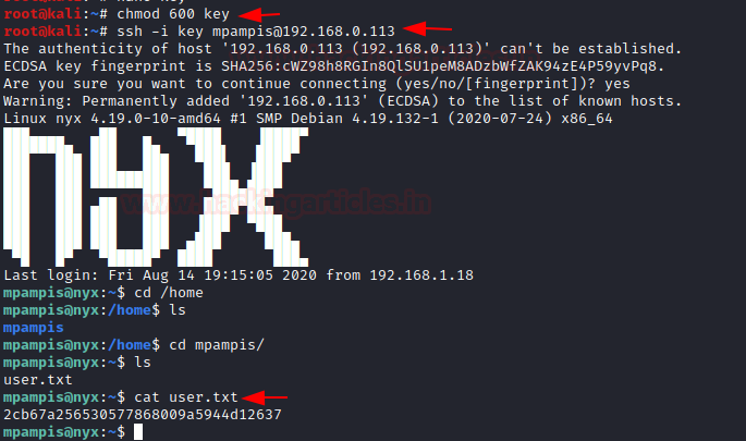 chmod 600 key ssh -i key mpampis@192.168.0.113 cd /home ls cd mpampis/ ls cat user.txt