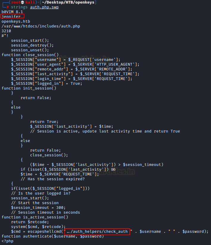 We download both the files on our local system to properly inspect them. The auth.php file was empty. That is not surprising as we have a vim swap file with it. It means that the author of the php file was in the process of creating/editing the file but vim couldn’t properly save it due to some unknown reason. We check the contents of the swap file using strings. This file discloses a username: jennifer and another directory called auth_helpers and a file inside it that checks the authentication on the initial login form.