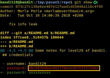 mkdir /tmp/pavan5 cd /tmp/pavan5 git clone ssh://bandit28-git@localhost/home/bandit28-git/repo ls cd repo/ ls cat README.md