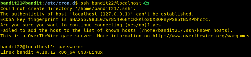 Now that we have the password for the next level, we will login as bandit22 using SSH.