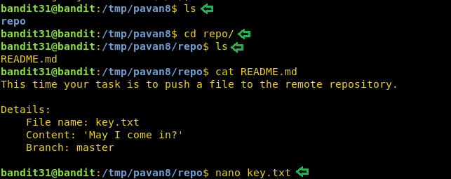 mkdir /tmp/pavan8 cd /tmp/pavan8 git clone ssh://bandit31-git@localhost/home/bandit31-git/repo