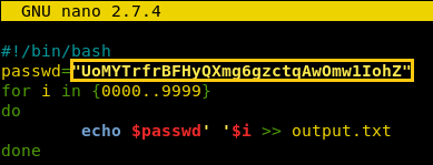 #!/bin/bash passwd="UoMYTrfrBFHyQXmg6gzctqAwOmw1IohZ" for i in {8000..8999} do echo $passwd' '$i >> output.txt done