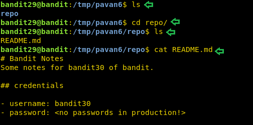 mkdir /tmp/pavan7 cd /tmp/pavan7 git clone ssh://bandit30-git@localhost/home/bandit30-git/repo