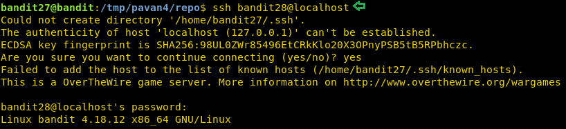 Now that we have the password for the next level, we will login as bandit28 using SSH.