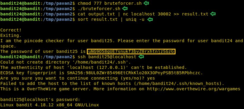 Now before running the above script, let’s first give it proper permissions. After that, we will run the script. Now, to apply Bruteforce, we will have to use piping (|). We will first read the password we created inside the output.txt than we will feed its output to the nc at 30002 port. Further, we will feed the output to a file called result. This will make reading the password easier. Now using the sort command combined with the uniq command, we will extract the correct password easily. Now that we have the password for the next level, we will login as bandit25 using SSH.