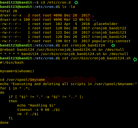 On this level, we are informed that there is a cron script running and we need to enumerate /etc/cron.d/ for the password. So, we traversed to that path. We use ls command to show the list of files inside the directory. As the next level is bandit24 so we read the cronjob_bandit24 using cat command. It shows that there is a script at /usr/bin/cronjob_bandit24.sh. So, we read that script using cat command. We see that we have a script with a variable named myname which consists of the output of the whoami command. The script first changes the name directory to /var/spool and then executes files with the variable myname file. And after executing it deletes all files inside that directory.