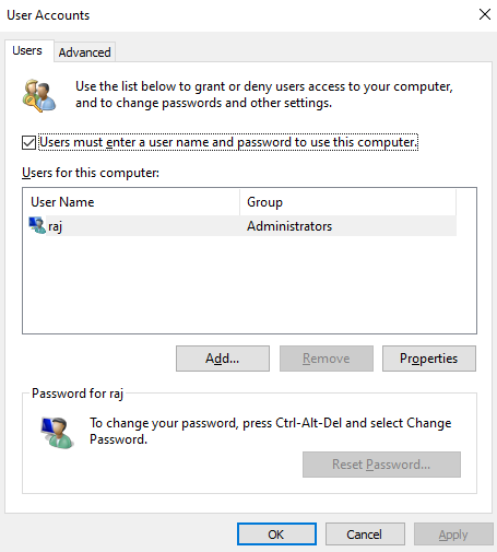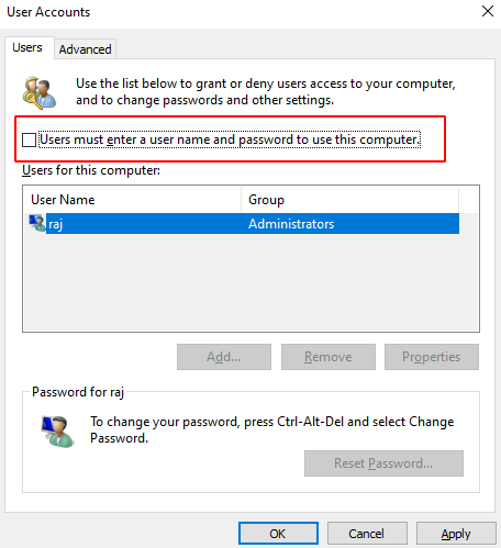 To enable an account to auto-login, we’ll simply uncheck the first option which is by default checked.