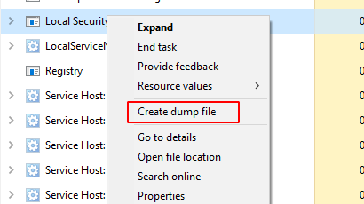 Go to task manager and find lsass.exe file and right-click to create a dump file.