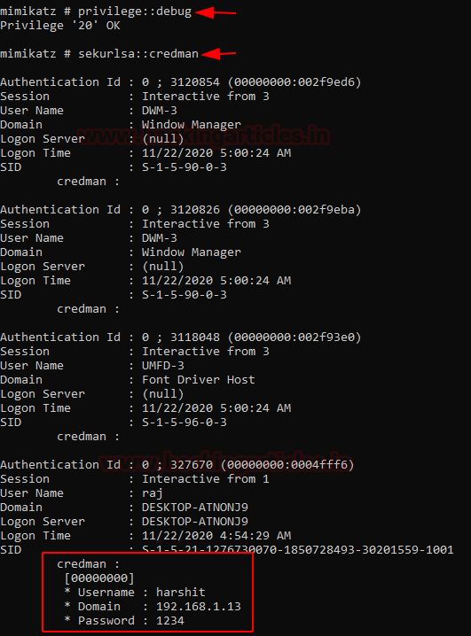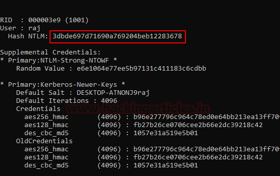 We’ll see that various hashes are now dumped among which our user credentials are given too.