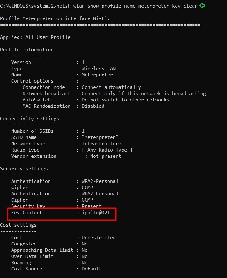 Further, to know the passwords of any one of the mentioned SSIDs use the following command :