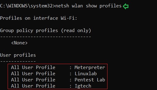 And as a result of the above command, you can see the names of the Wi-Fi networks that connected the system in the past or present such as Meterpreter, Linuxlab, etc. The image above demonstrates the same.