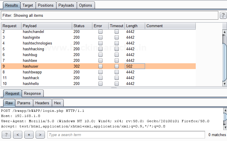 Sit back and relax because now the burp suite will do its work, match the password which will give you the correct password. The moment it will find the correct value, it will change the value of length as shown in the image.