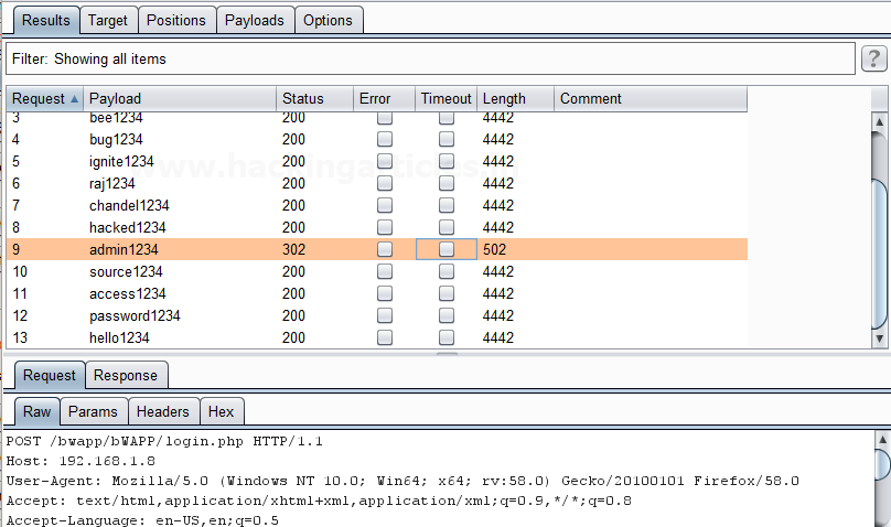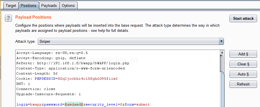 Send the captured request to the Intruder by clicking on the Action Tab and follow given below step. Now open the Intruder tab then select Positions tab and you can observe the highlighted password and follow the given below step for selecting payload position.