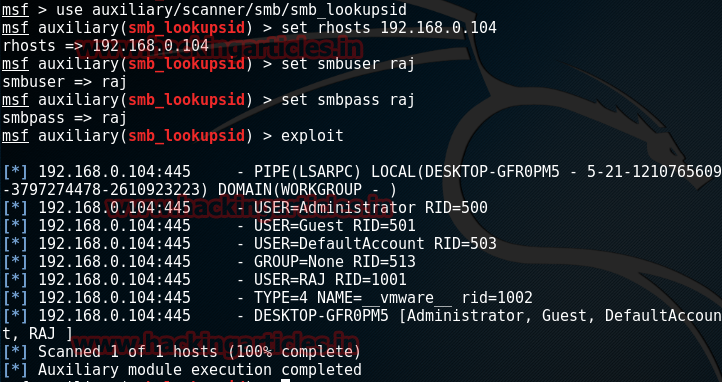 msf exploit (smb_lookupsid)>set rhosts 192.168.0.104