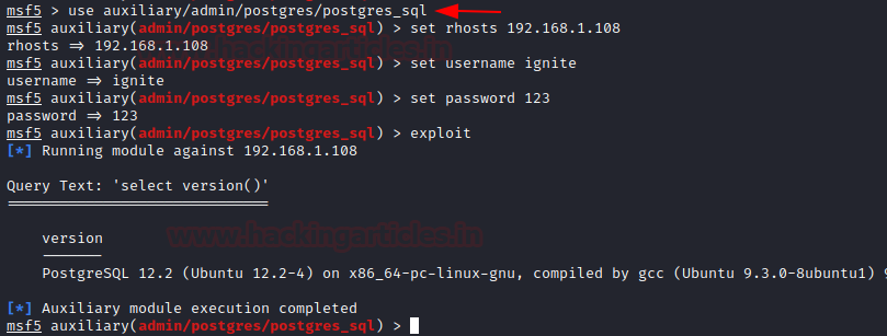 msf > use auxiliary/admin/postgres/postgres_sql msf auxiliary(admin/postgres/postgres_sql) > set rhosts 192.168.1.108 msf auxiliary(admin/postgres/postgres_sql) > set username ignite msf auxiliary(admin/postgres/postgres_sql) > set password 123 msf auxiliary(admin/postgres/postgres_sql) > exploit