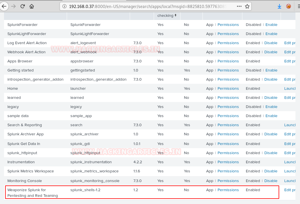 Once restarted, go to apps tab again, Find your installed archive (weaponize Splunk for red teaming and pen testing)