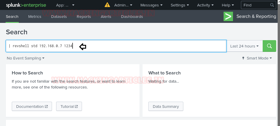 Now to execute the shell. We navigate to the search option in Splunk and type in our command defining that we want a reverse shell of standard type to talk to out attach machines IP on the listening port.
