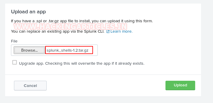 For installing any app slunk provides upload form to browse any .spl or .tar.gz for uploading. Taking advantages of functionality we will try to upload our Splunk shell that we had downloaded previously.