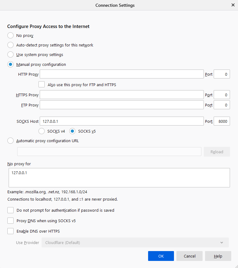 Now in the Windows machine, open the browser and open proxy settings. Here, choose to manually configure the manual proxy configuration and mention the local address in the socks host and mention the port number as 1080. Choose the socks version 5 and then mention the local address in the ’no proxy for’ space.