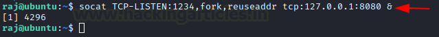 Socat is generally a command-line utility available in Linux. It transfers data between two hosts. Here, we use it for port forwarding. Specifically, we configure it to redirect all TCP connections from 127.0.0.1:8080 to port 1234.