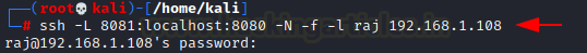 ssh -L 8081:localhost:8080 -N -f -l raj 192.168.1.108