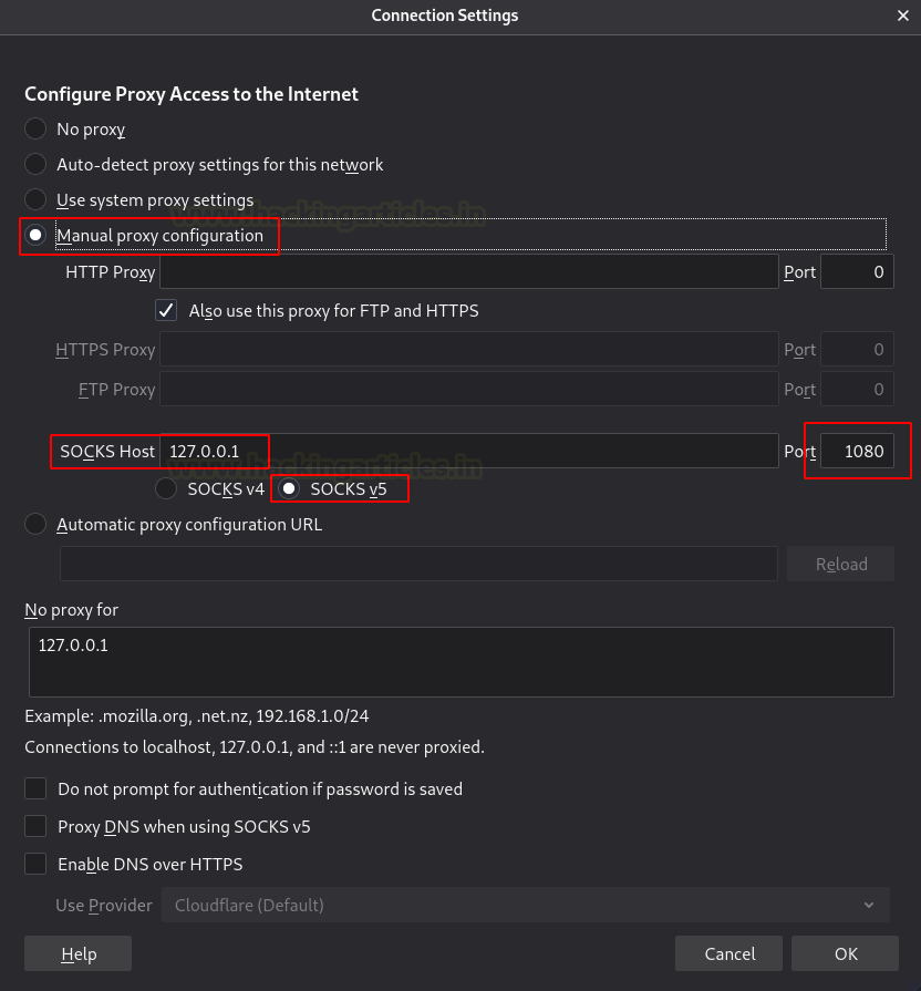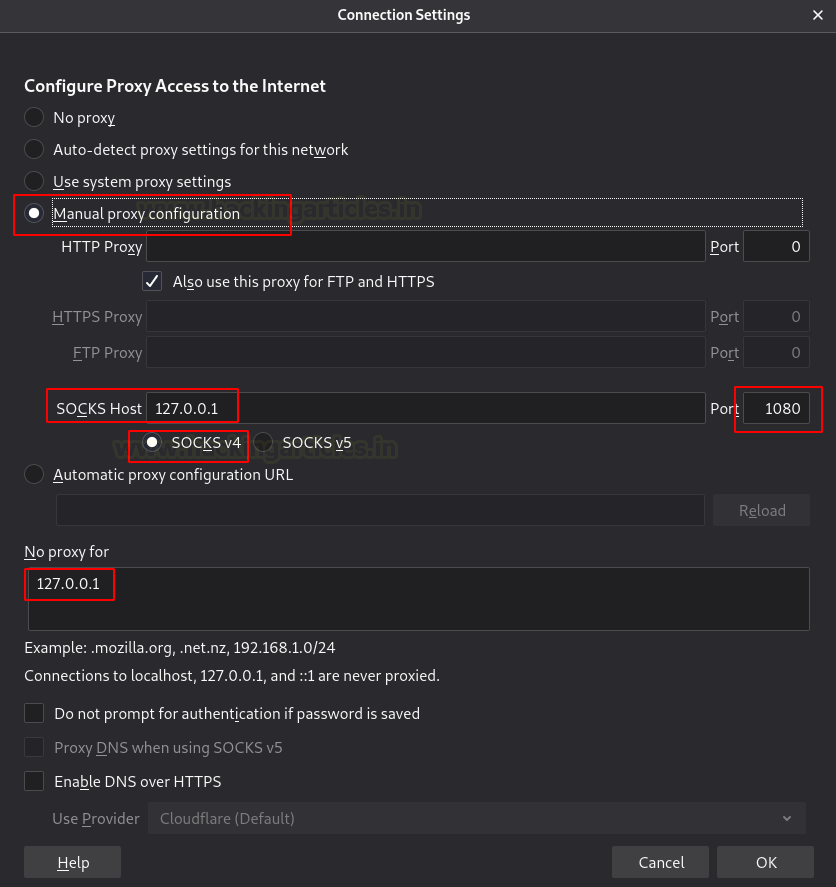 Now let’s open the web browser in the Kali Linux and go to configure the proxy settings. Here we are manually configuring the proxy, therefore, mention the SOCKS host address as the local address i.e., 127.0.0.1 and choose socks5 proxy on port 1080. Also, mention the local address in the ‘no proxy for’ box.