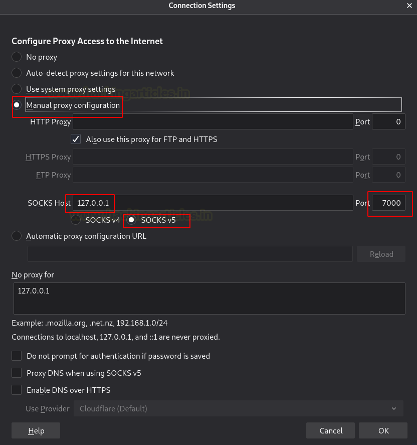 Once the connection between the Kali Linux and Ubuntu is made, let’s open the browser in the Kali Linux machine and configure the proxy in the settings. Choose to manually configure the proxy and mention the local address as the socks host and the port number as 7000. Now select the socks version 5 and mention the local address in ‘no proxy for’ section.