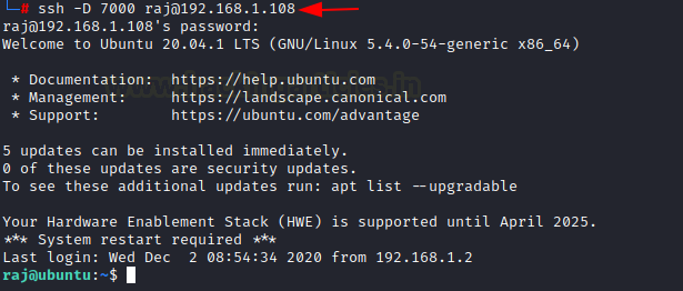 In Kali Linux machine let’s run the command to connect with the Ubuntu using Dynamic SSH tunnelling.