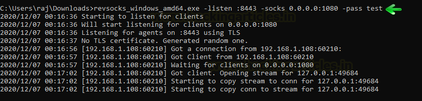 revsocks_windows_amd64.exe -listen :8443 -socks 0.0.0.0:1080 -pass test