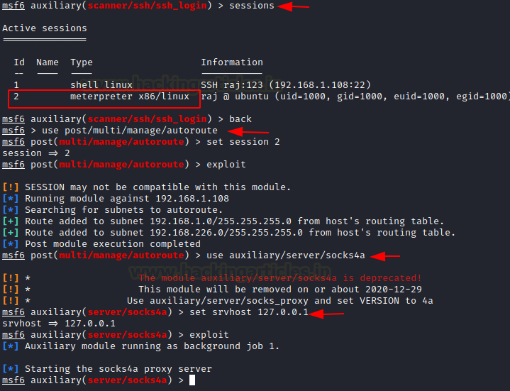 use post/multi/manage/autoroute use auxiliary/server/socks5 set srvhost 127.0.0.1 exploit