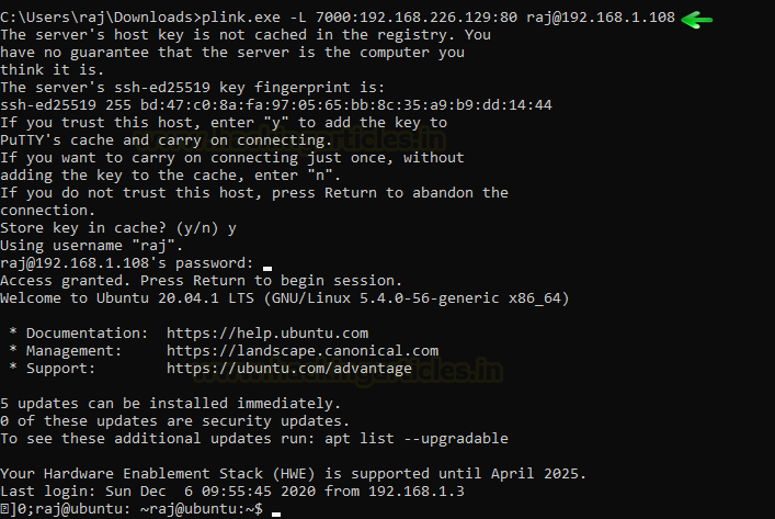 plink.exe -L 7000:192.168.226.129:80 raj@192.168.1.108