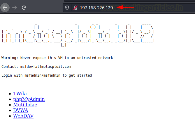 When you open the web browser in the Kali Linux and mention the IP address of the Metasploitable 2, you will be connected with the Metasploitable 2 using Metasploit.